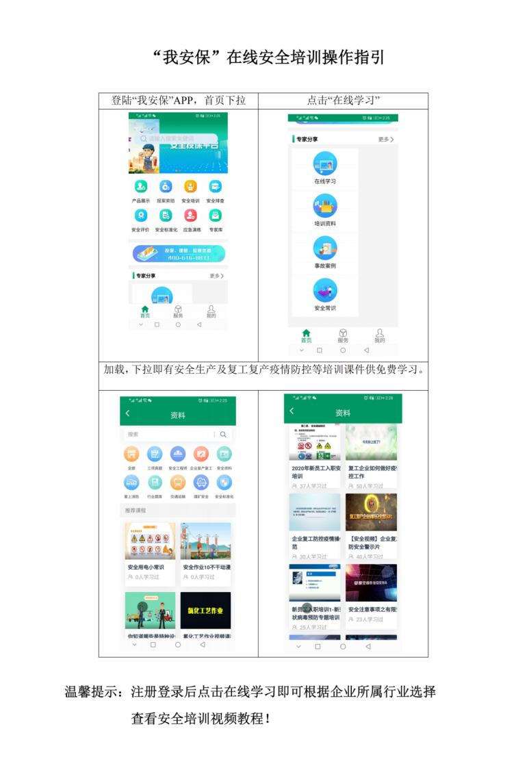 全國范圍新冠疫情已得到有效控制,各地都在緊張的組織企業復工復產,安全生產是企業復工復產的重要保證。現階段,“我安保”APP線上培訓所有資源均免費向企業開放,主要是針對各行業領域的企業從業人員進行安全生產教育線上培訓,江泰公司上傳培訓視頻資源,還與專業的安全培訓機構合作,安全教育培訓資源豐富,涉及的行業領域齊全,非常適合疫情當下企業復工復產開展線上安全生產培訓。